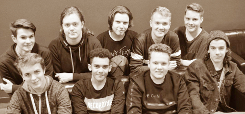 Hintere Reihe (vlnr): Dario Schüler (bsax), Alexander Köper git), Matthias Fenchel (E-Piano), David Kapp (trp) Jannis Gröpl (trp)